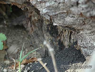 さて、最後のポイント、ニホンミツバチの巣です。大きなクヌギの根元に穴が開きニホンミツバチが出入りしていました。みんなが覗いたり写真を撮ったりして通路を塞いだので、沢山のミツバチが巣に戻れなくみんなの頭の上を飛び回っていました。 |